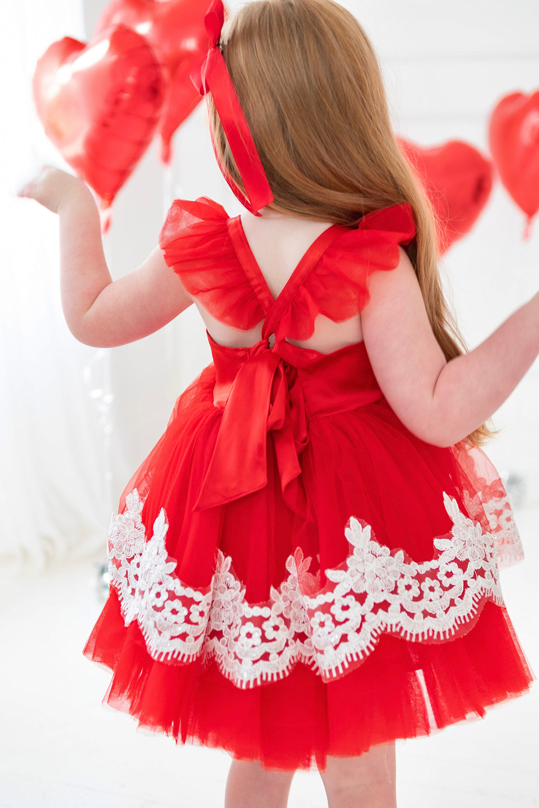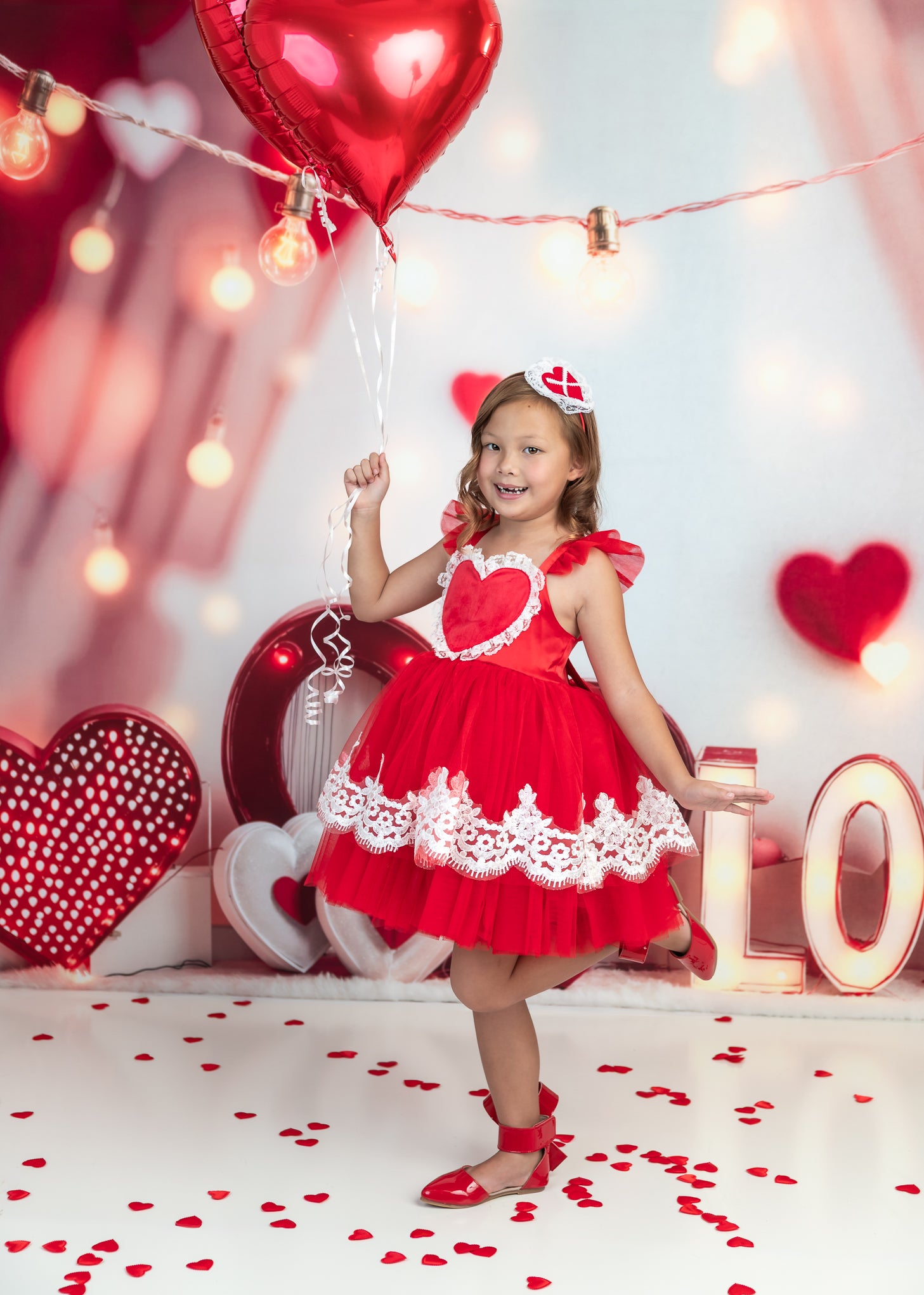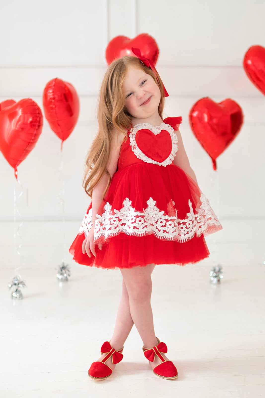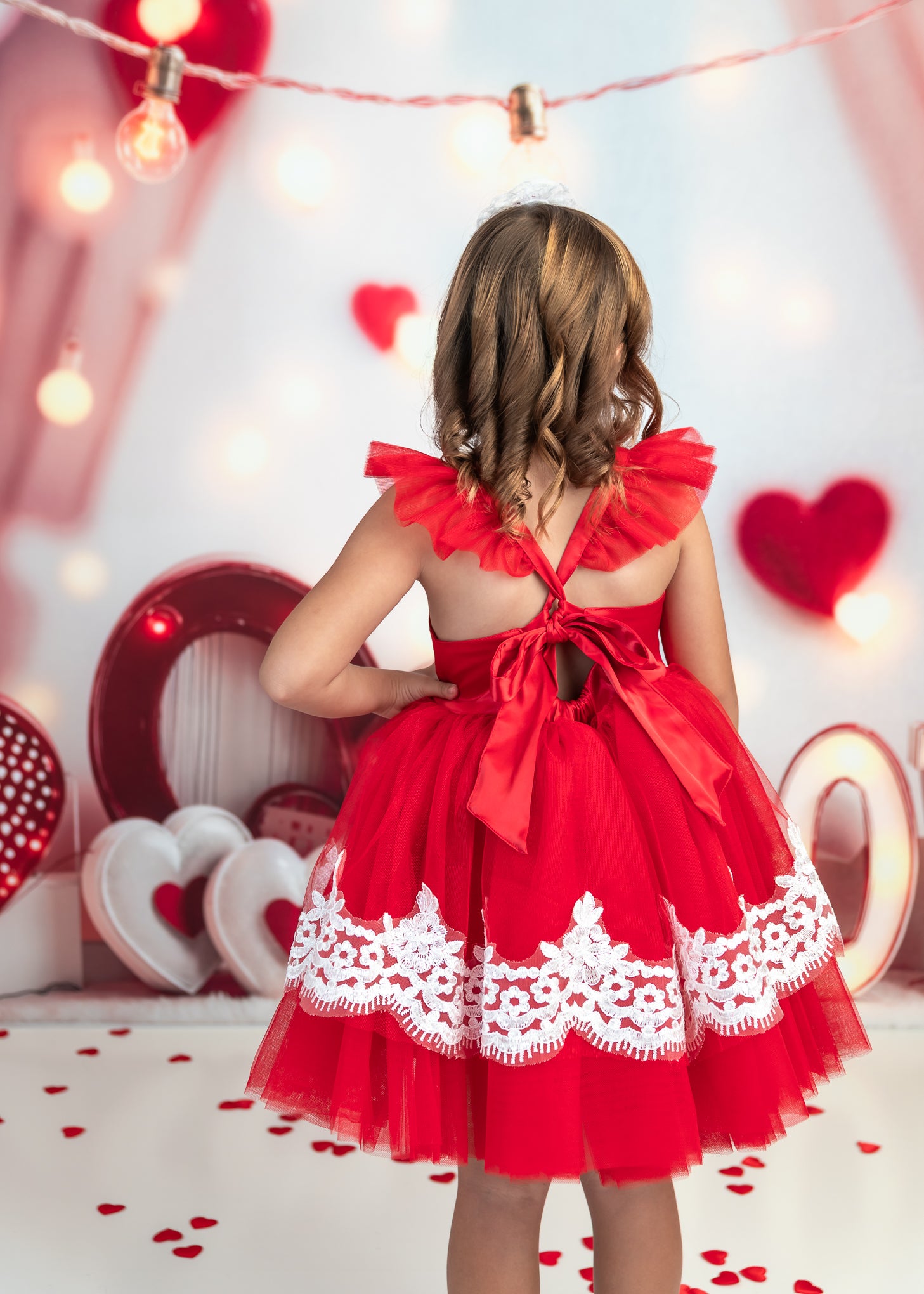 Introducing the Cherie Amour, the sweetest Valentine style for your little love. This rich red dress features a plush heart bodice framed in soft ruffles, giving it a picture-perfect look for parties, photos, and every heartfelt moment. The full tulle skirt is finished with detailed white floral lace that adds a dreamy touch and boutique quality.
