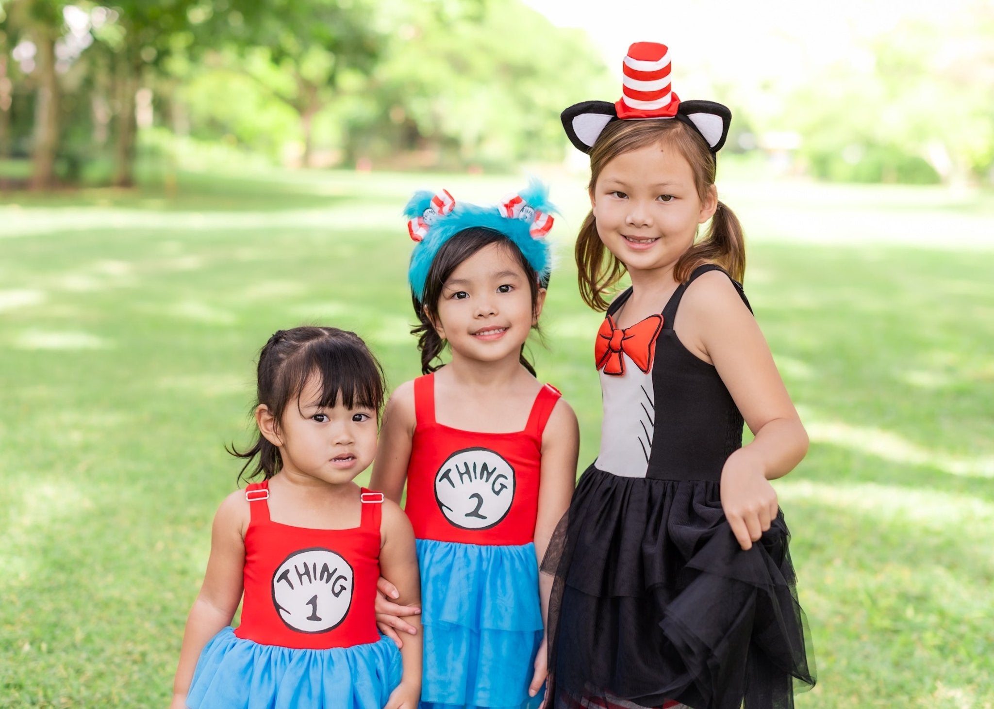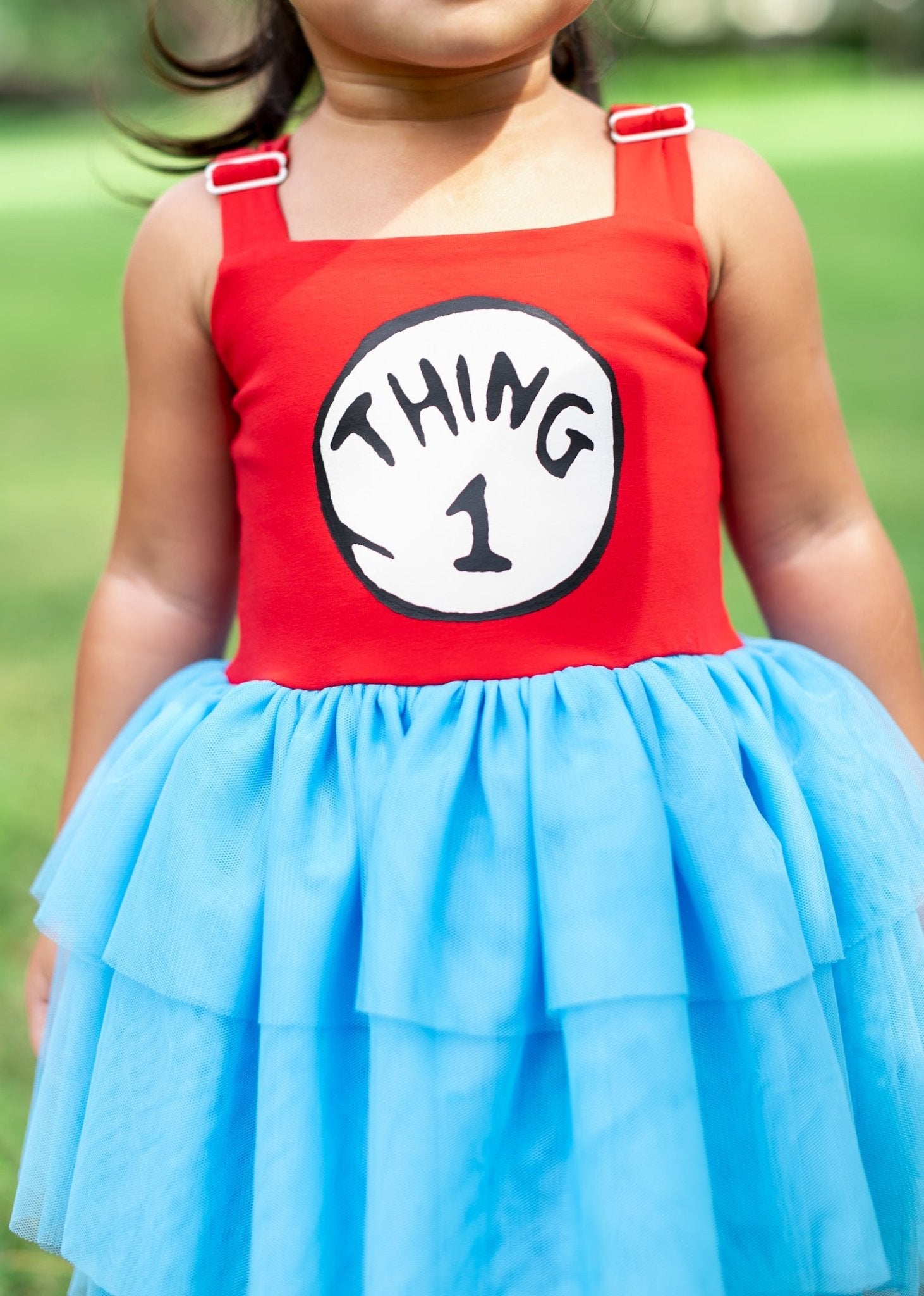 The Double Trouble Dress features a vibrant red bodice paired with a fluffy blue tiered skirt made for maximum twirl. The playful character detail on the front adds just the right amount of mischief, making this dress perfect for school celebrations, story time, and themed events.