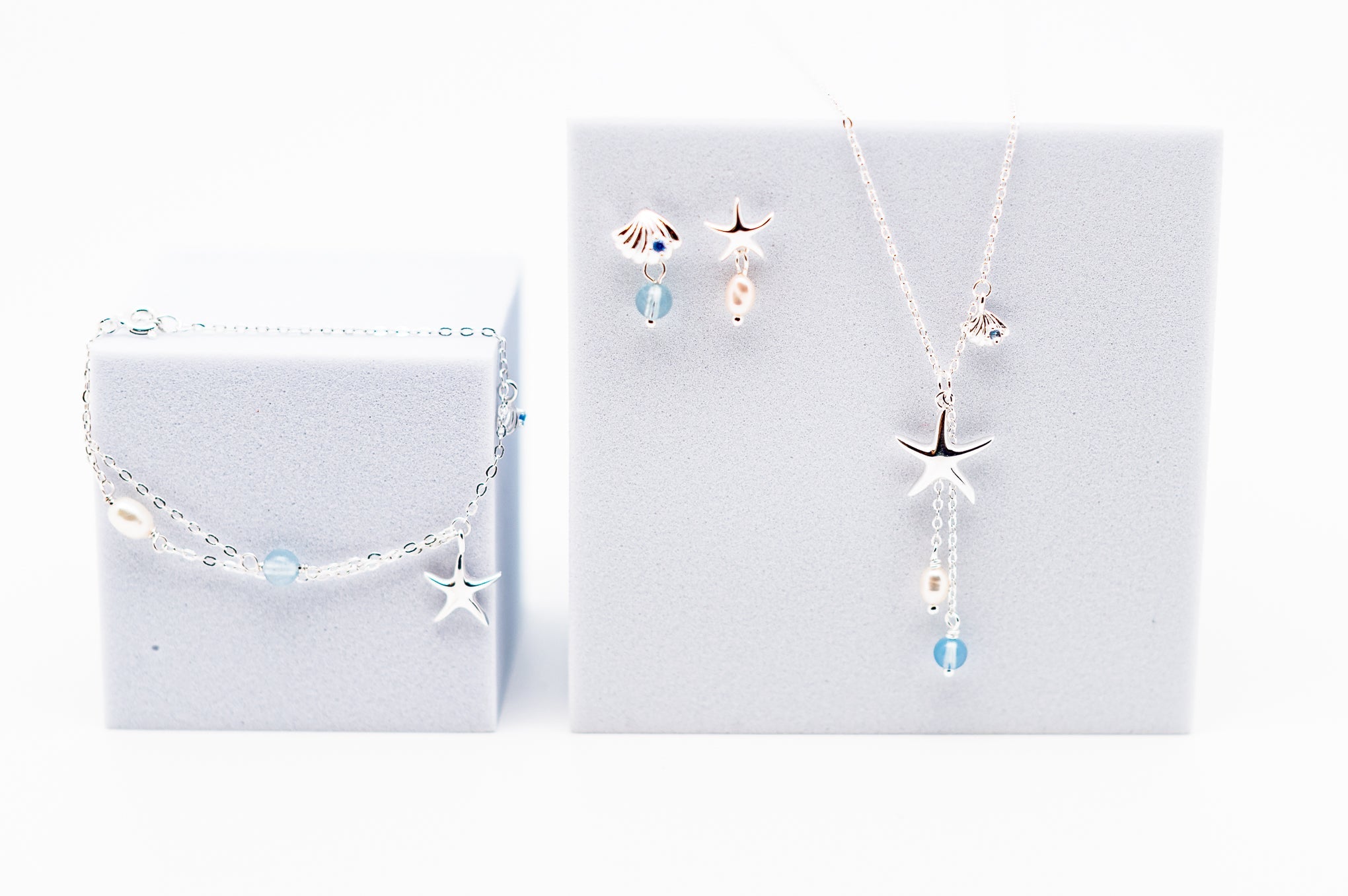 This ocean inspired jewelry set includes a matching necklace, bracelet, and a pair of earrings (set of two), all made of fine silver (.999 purity). Starfish and shell charms are paired with soft pearl accents and sea blue beads for a gentle coastal shimmer. The coordinated pieces create a polished look for vacations, gifting, or adding a seaside touch to any outfit.