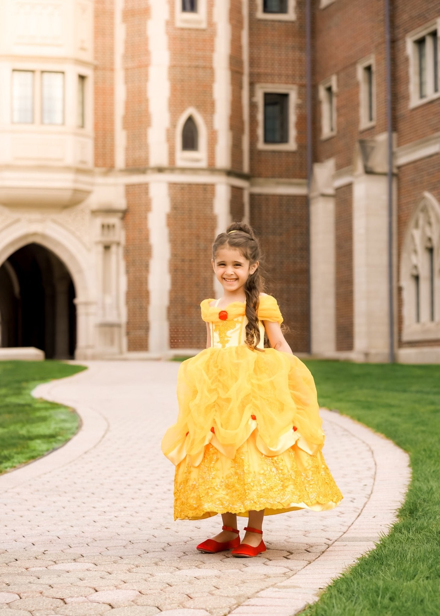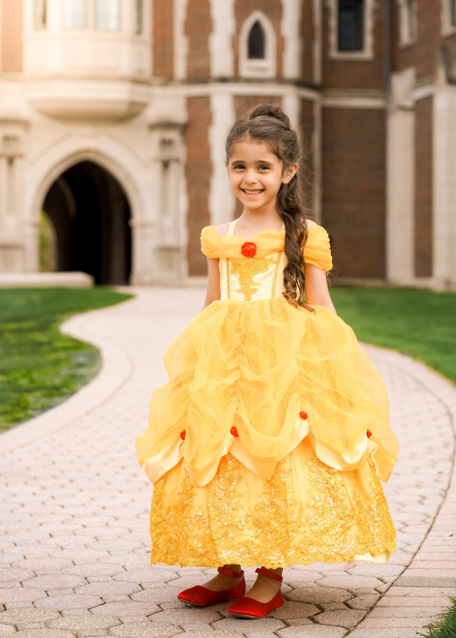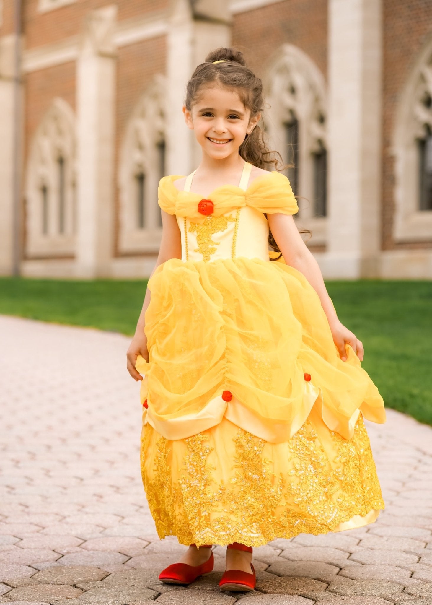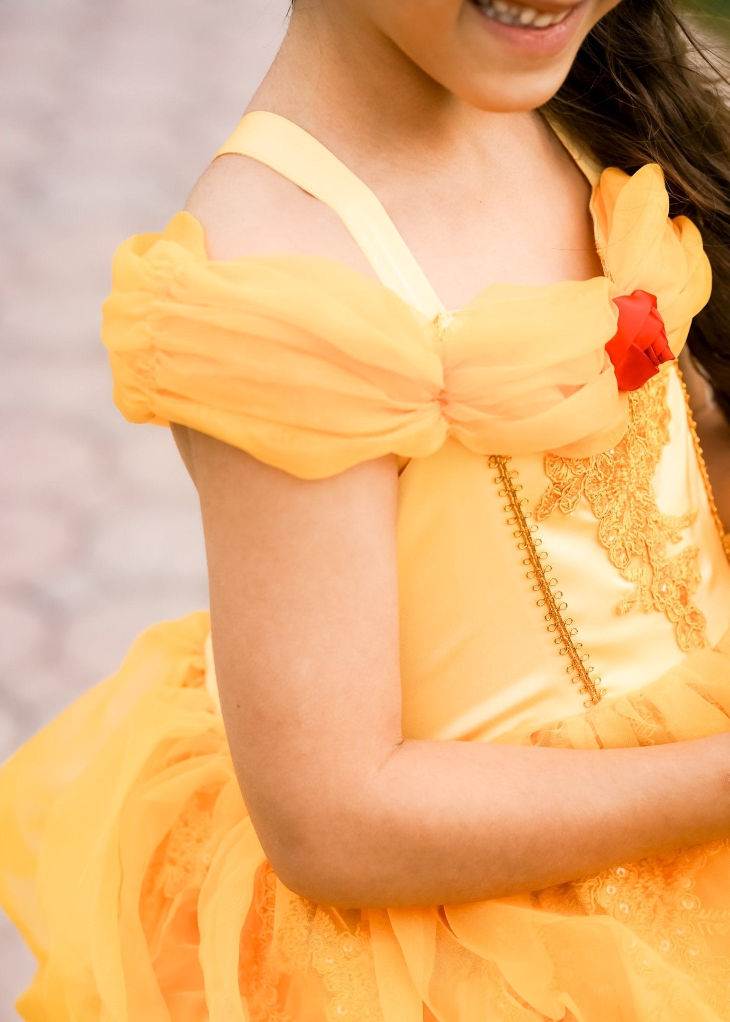 This ankle-length gown features a built-in crinoline layer for graceful volume and a storybook-worthy silhouette.