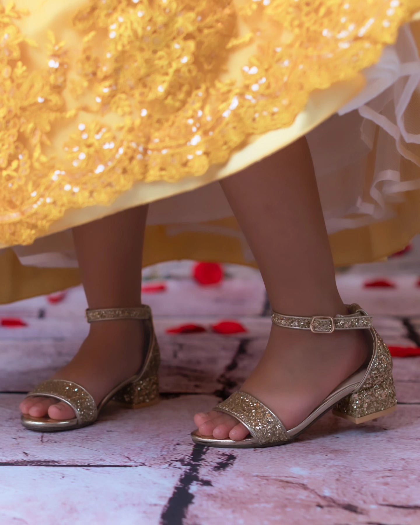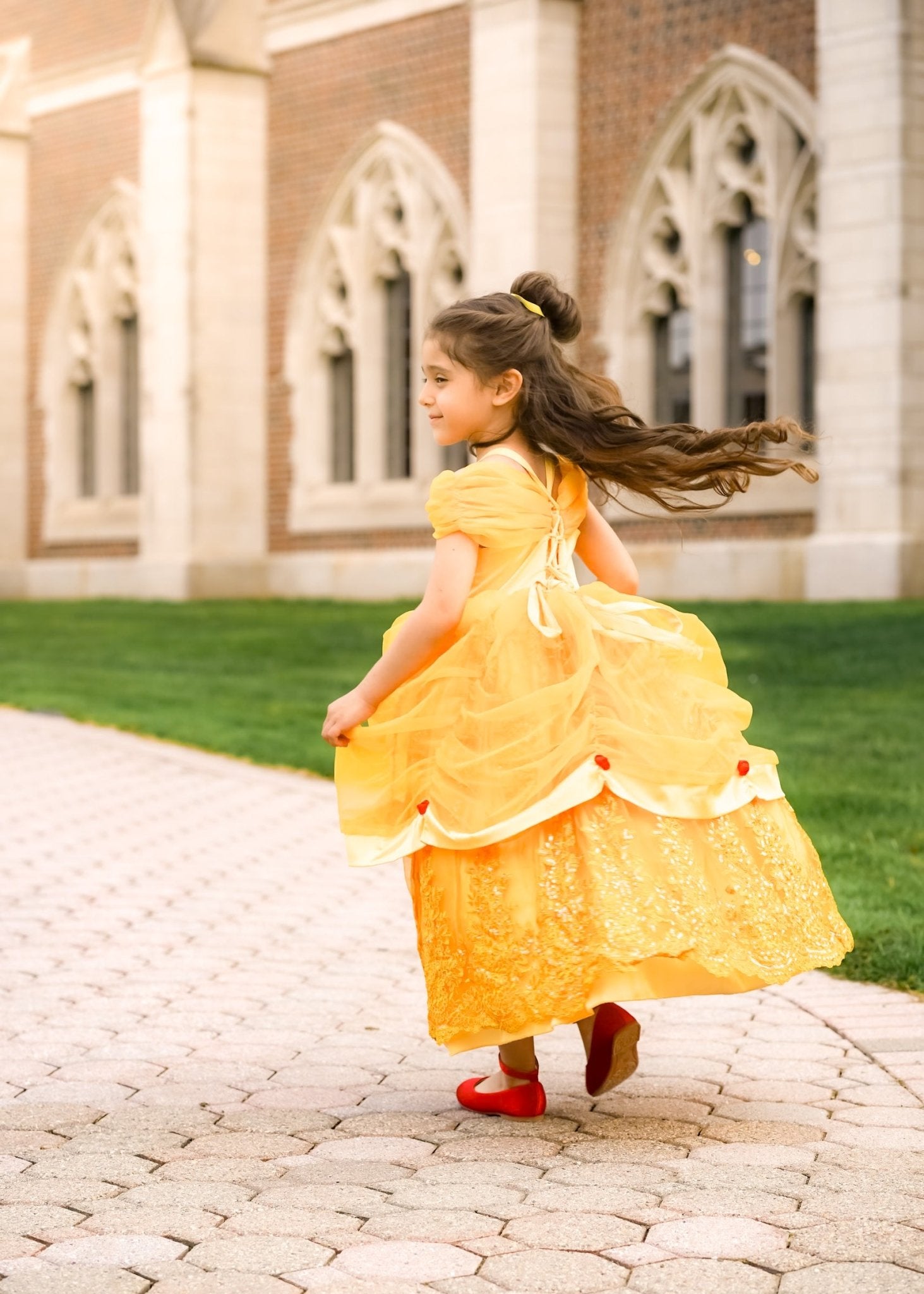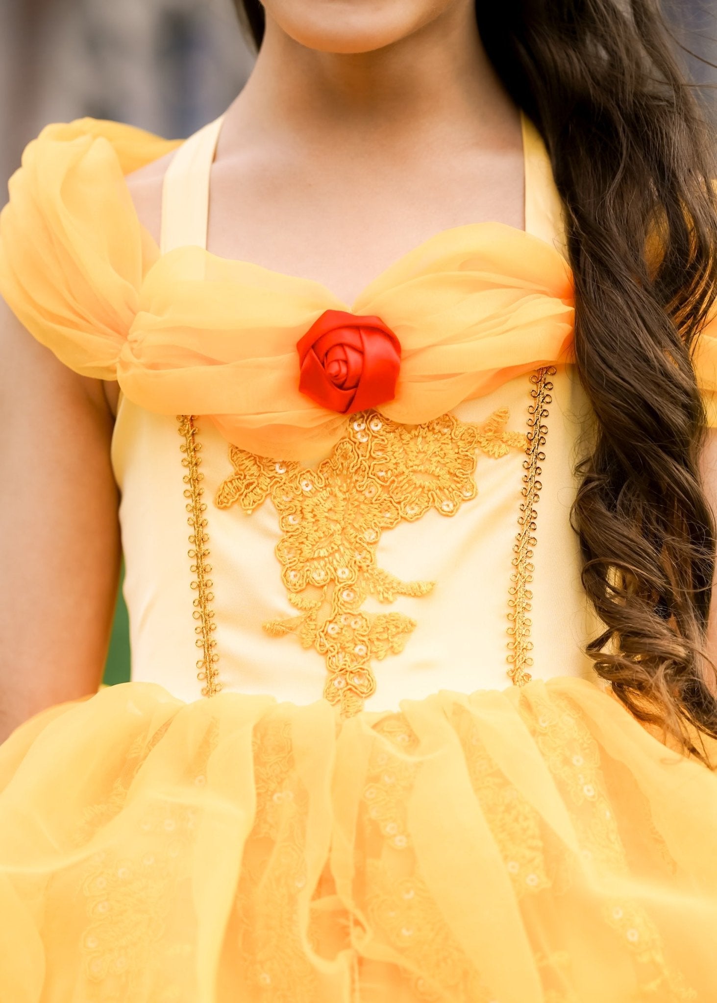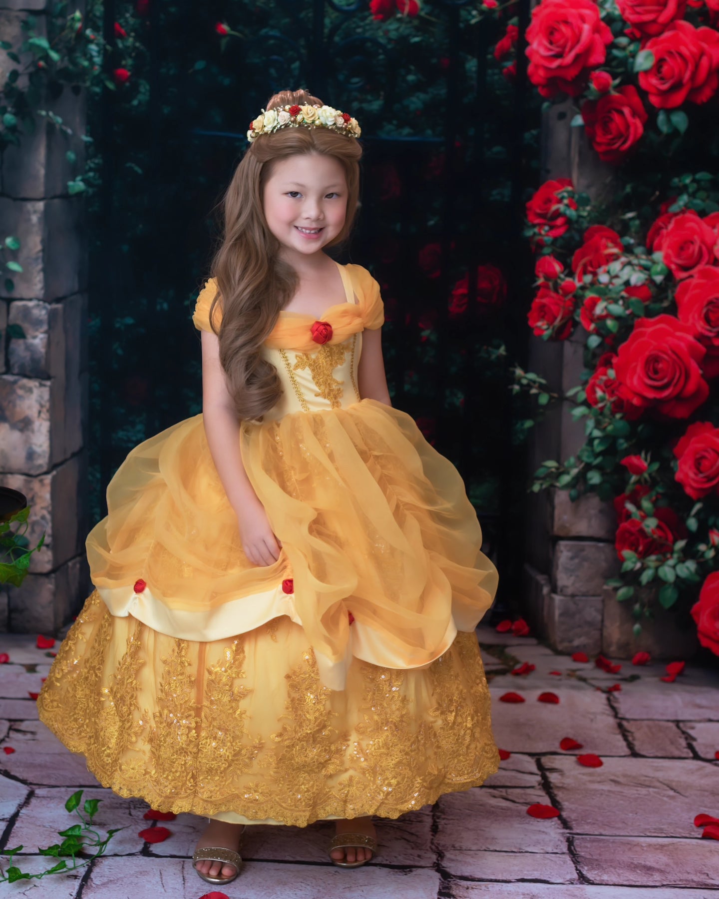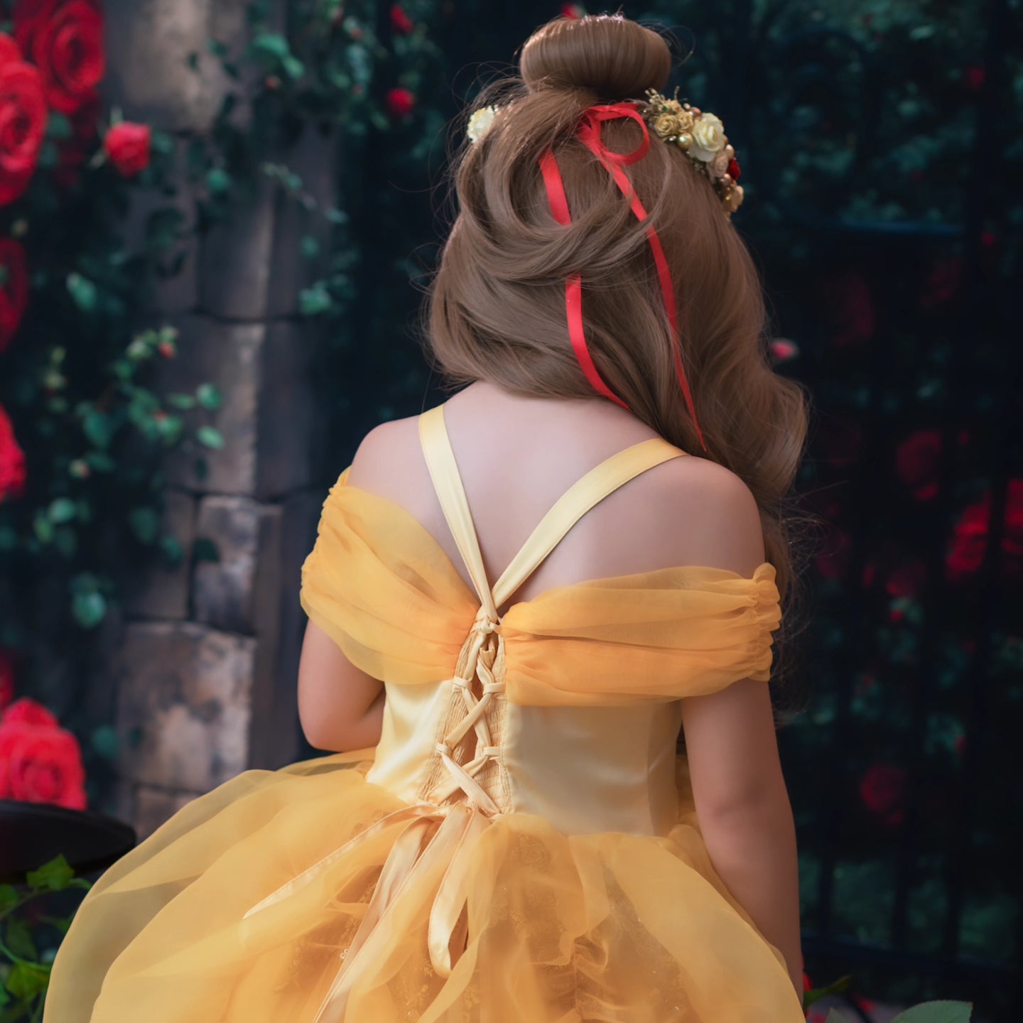A tale as old as time, reimagined in golden elegance. Forever Enchanted is crafted from high-quality organza and brocade lace with hand-placed red satin roses and a lace-up back for a beautiful, adjustable fit.
