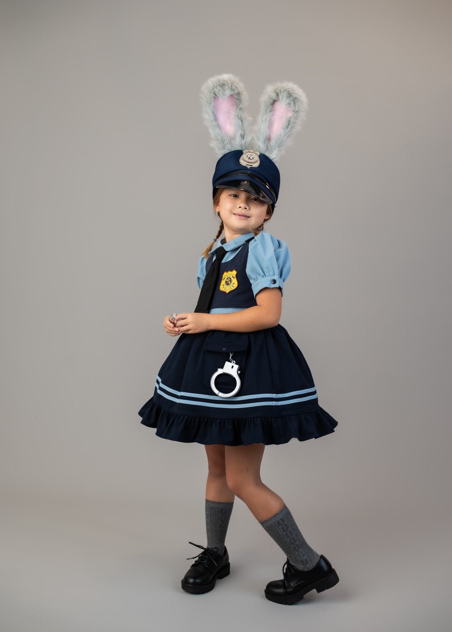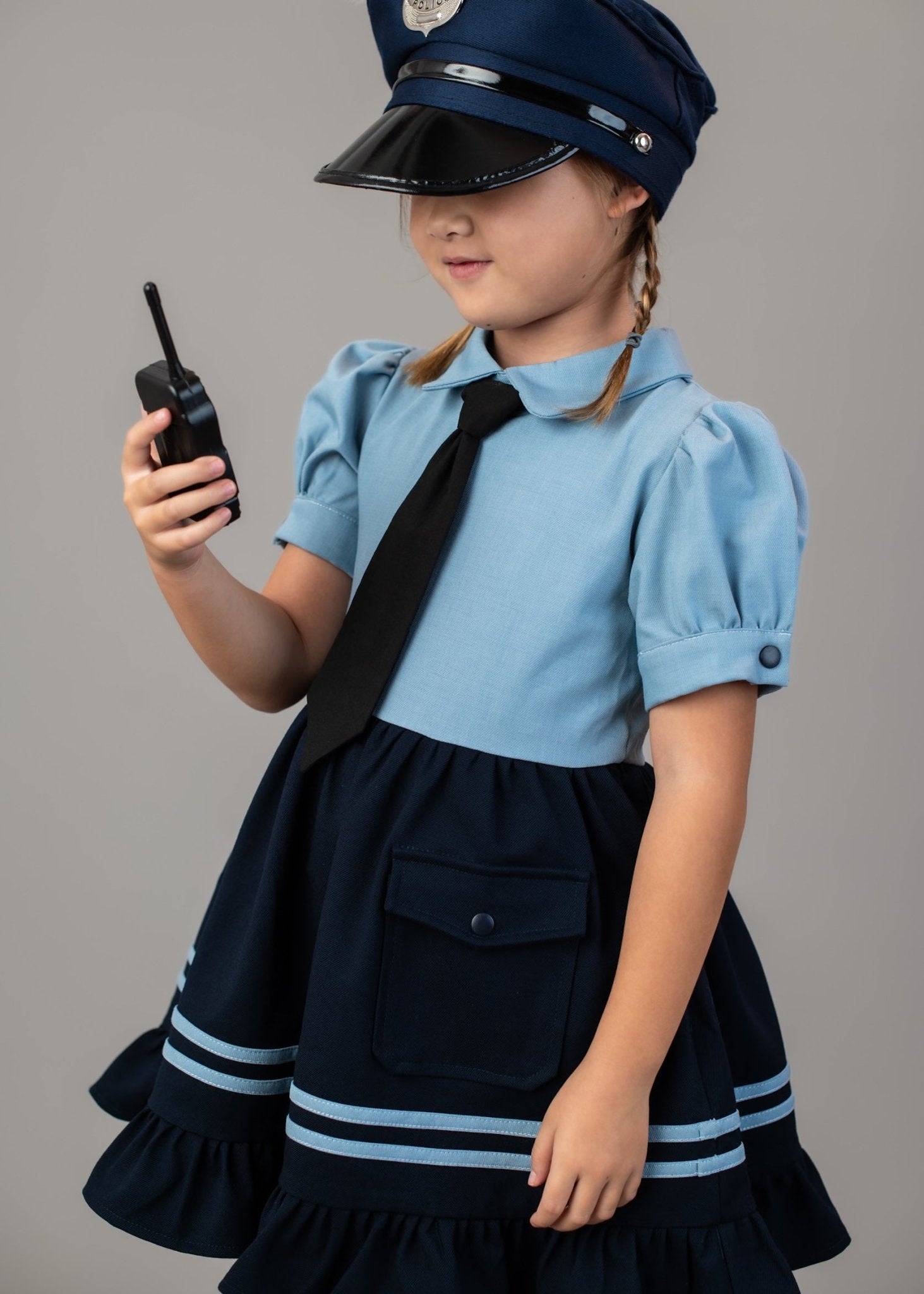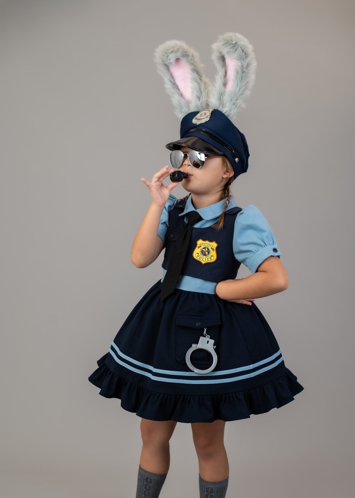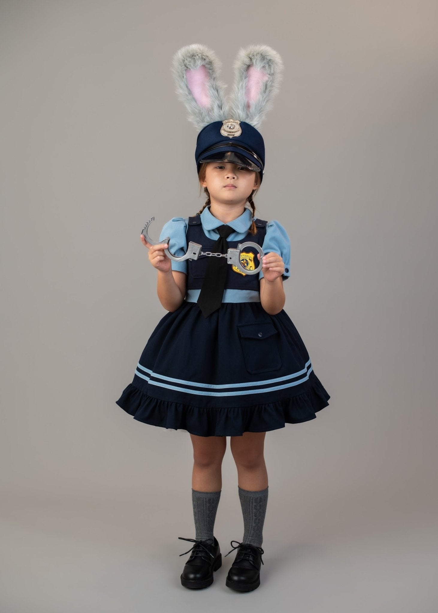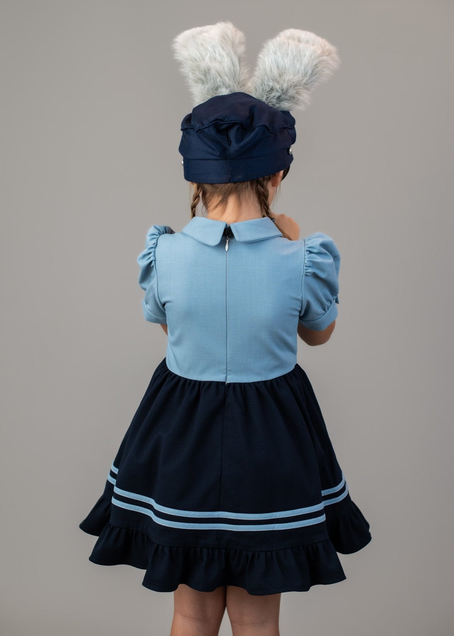 Our Hop Pursuit dress combines charm and courage in one adorable design. Featuring a collared light blue bodice layered under a removable navy vest with pocket detailing and a bright badge patch, it’s perfect for imaginative adventures or picture-perfect moments. The matching black tie is also detachable, giving the option for a more casual look.