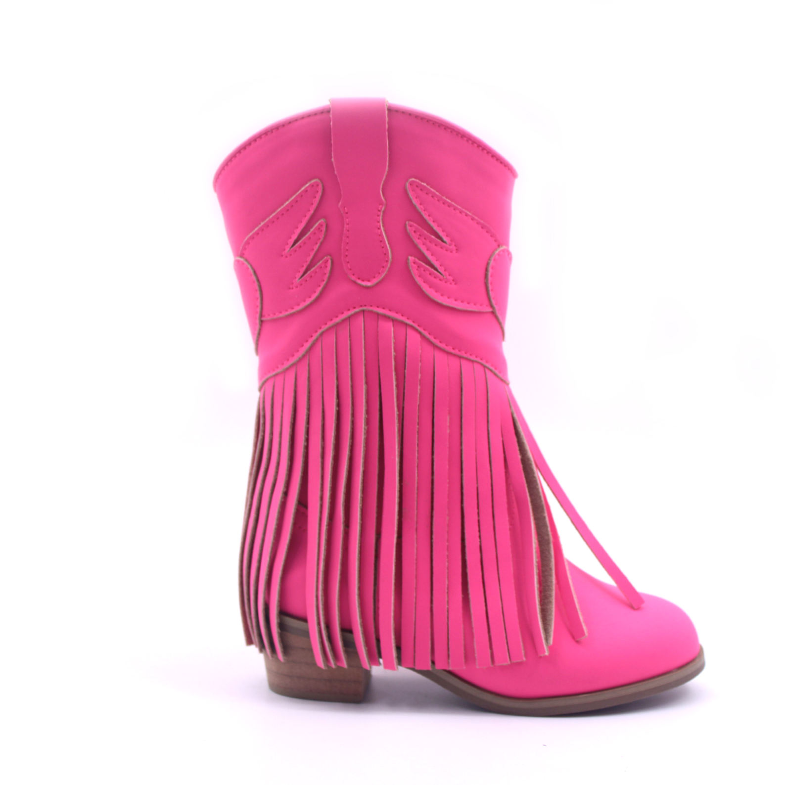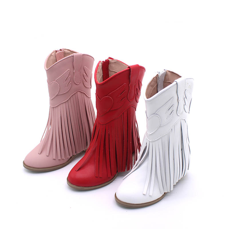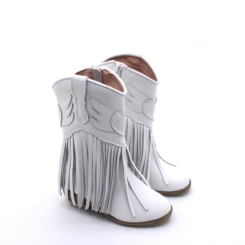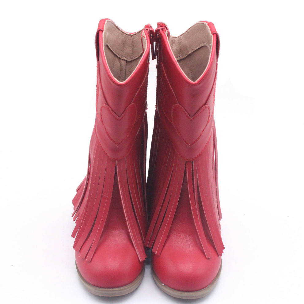 Elevate your little one's style with these Girls Jolene fringe leather Cowgirl Boots. Crafted from genuine leather, these boots feature a small heel and a mid-calf shaft for a classic cowgirl look. Pull-on design ensures easy on and off. Please note that these boots run a bit narrow and small, so it's recommended to size up for a comfortable fit. Perfect for adding a touch of Western flair to any outfit, these durable and stylish boots are a must-have for the fashion-forward child.