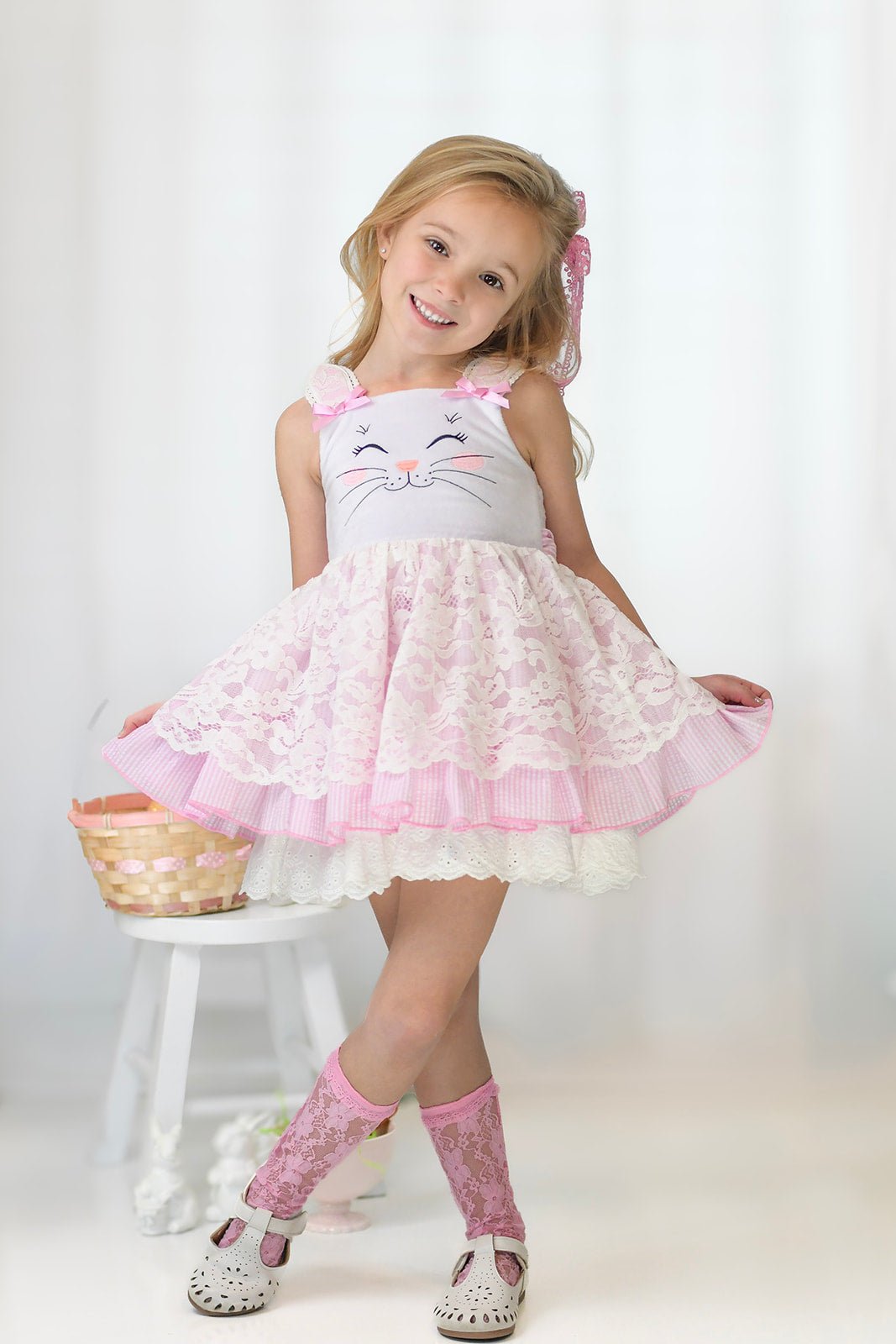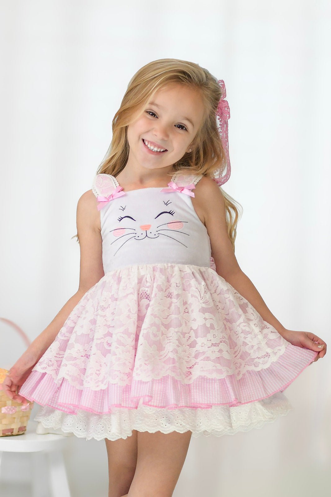 The Lace Loppsie Dress in Candy Pink is a sweet and timeless Easter dress designed with beautiful boutique details. Featuring a custom embroidered bunny face and lace overlay bunny ears, this dress is perfect for Easter celebrations, spring photos, and special occasions.