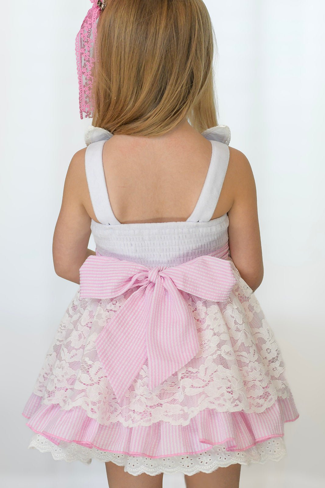 A soft velvet bodice pairs effortlessly with wrinkle-resistant candy pink gingham and delicate lace for comfortable wear and a polished look. Designed with both style and practicality in mind, Lace Loppsie is easy to wear while still feeling special and photo-ready.