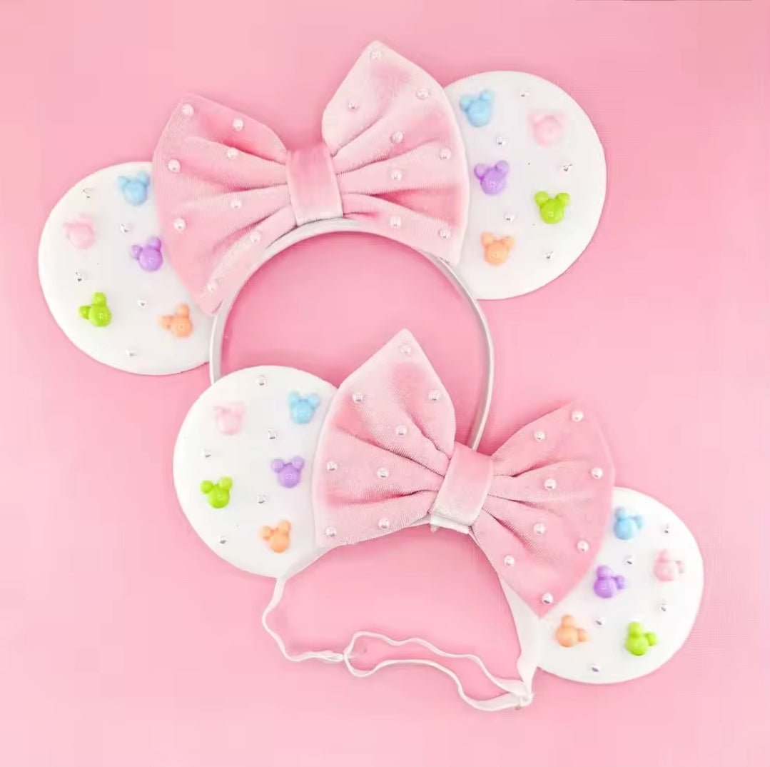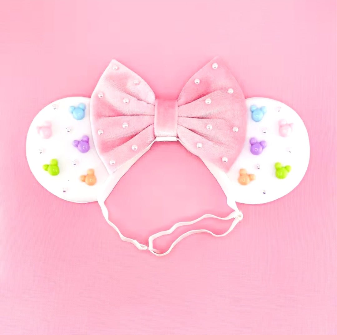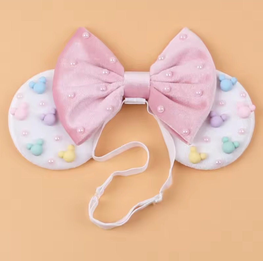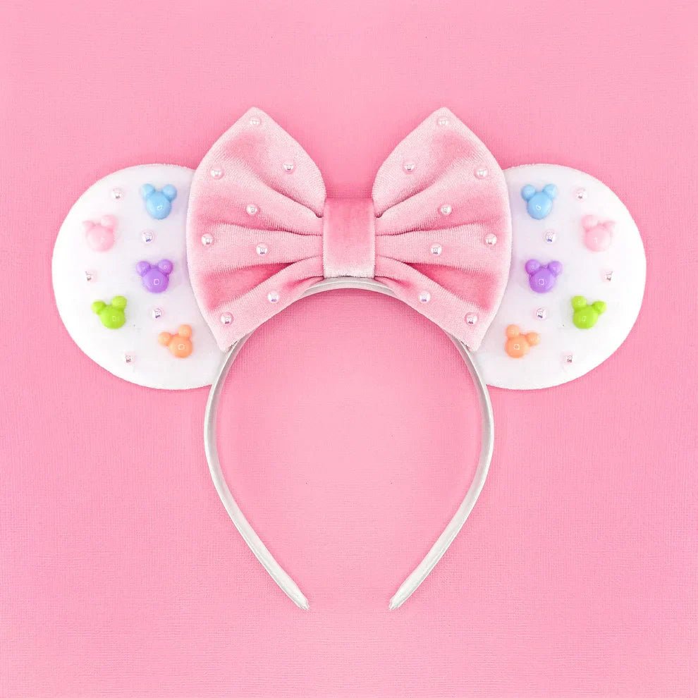 Confetti Pastel Ears – Soft white ears sprinkled with colorful mini mouse icons and pearls, paired with a sweet pink bow for a playful, candy-inspired look