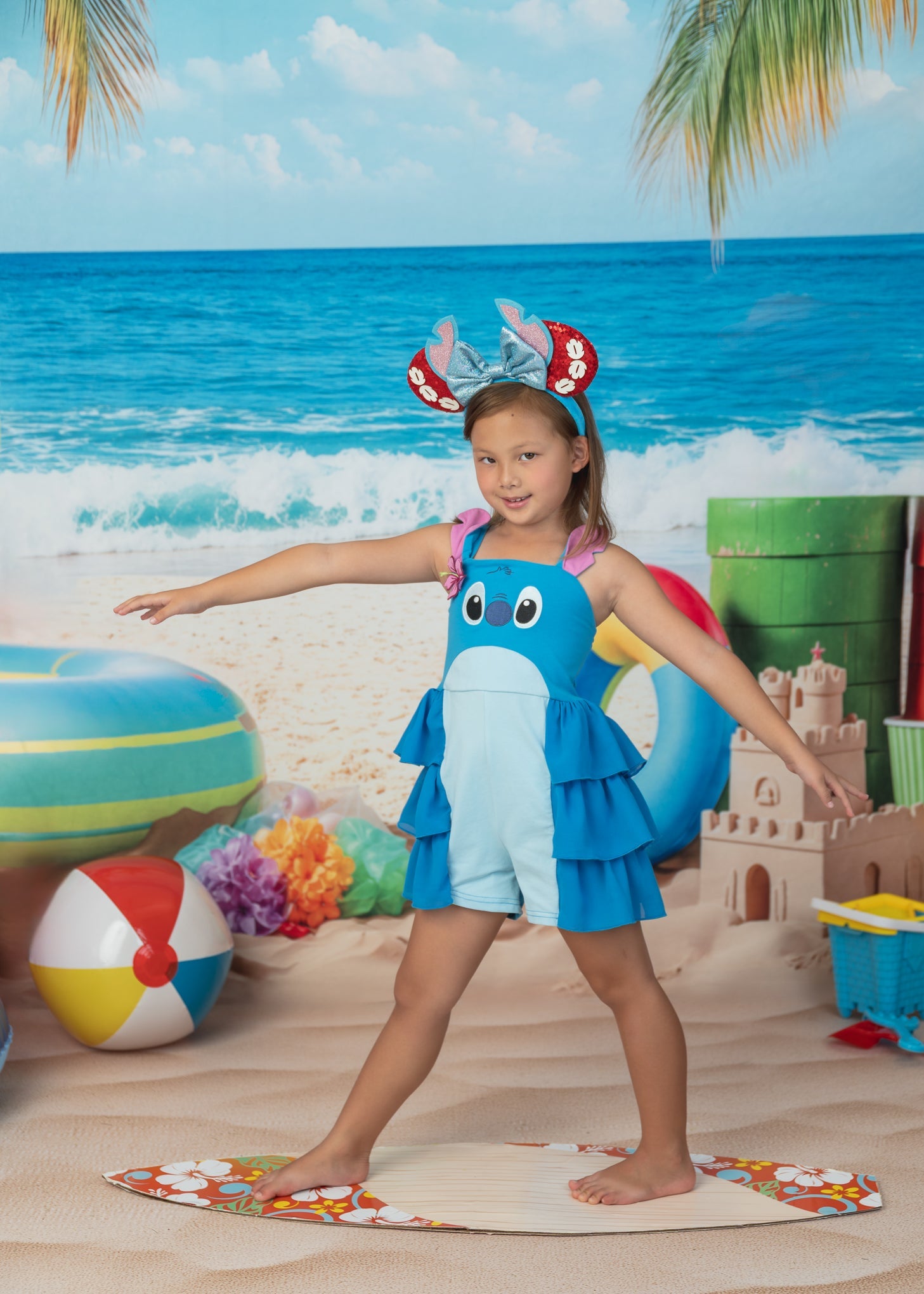 Get ready for a little mischief and a lot of aloha! This tropical romper is inspired by a certain lovable blue experiment and is perfect for your next park adventure or summer getaway. Made from soft and stretchy cotton spandex, it features fluttery chiffon ruffles and adjustable straps for the perfect fit.