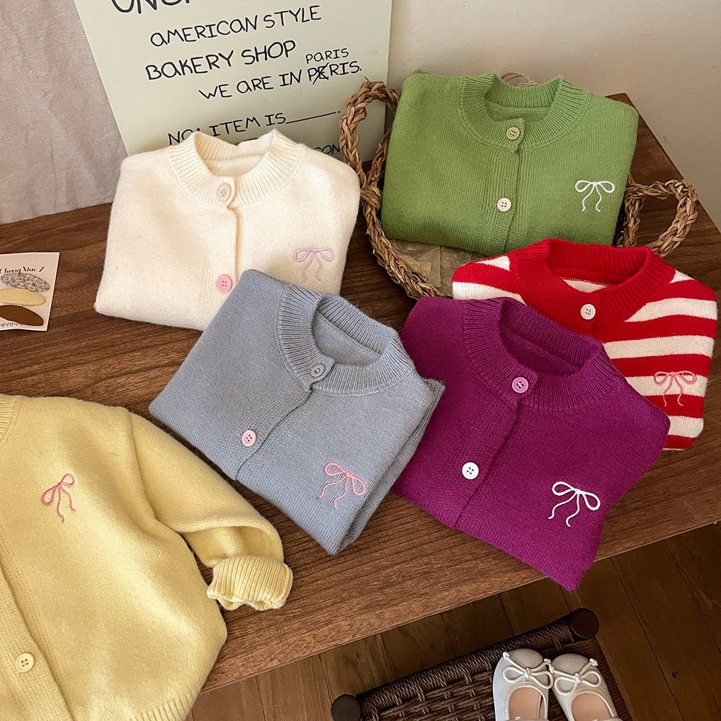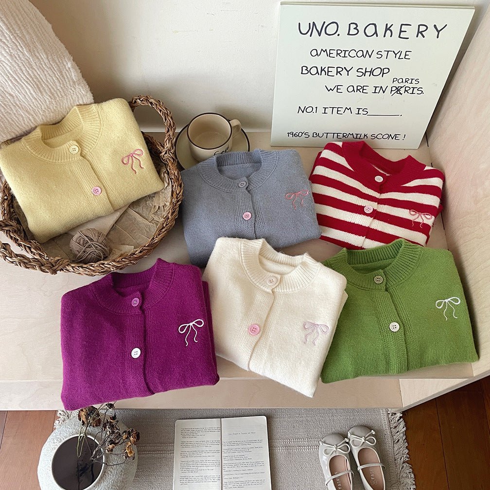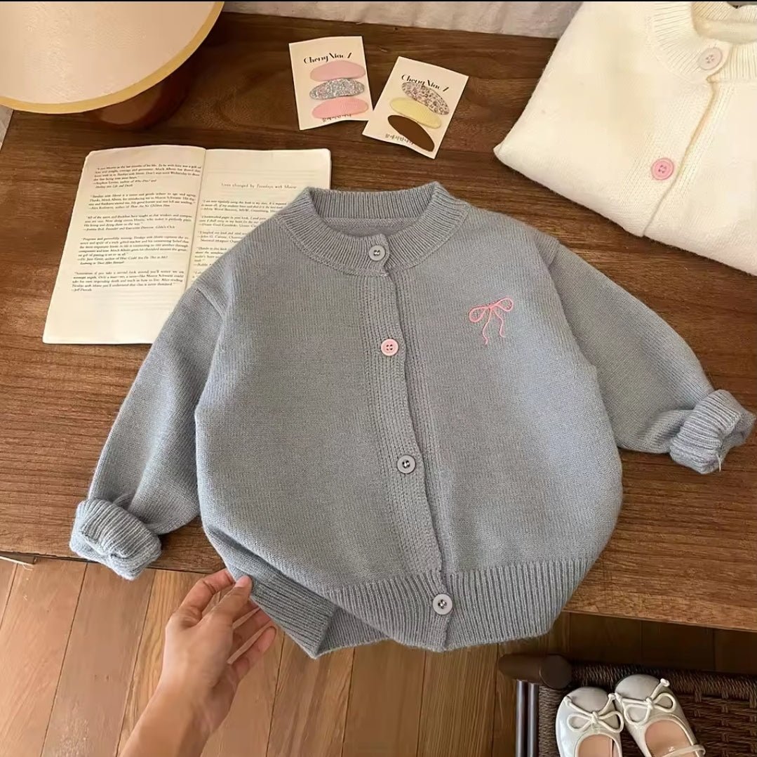 Crafted from a soft, comfortable knit, this cardigan features a charming embroidered bow detail on the chest, button-front closure, and a classic silhouette that pairs effortlessly with dresses, tops, and tunics. Whether styled for school, family photos, holidays, or everyday wear, this cardigan is a true wardrobe staple.