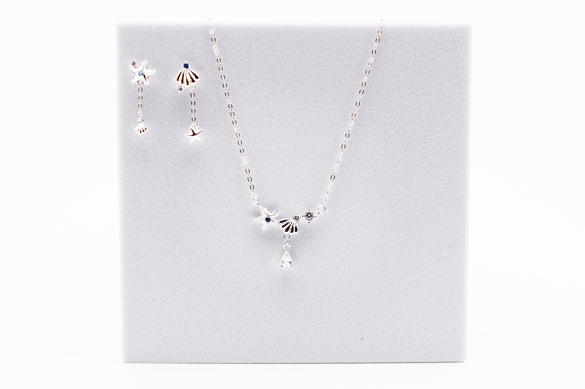 This detailed coastal set includes a fine silver necklace, bracelet, and a matching pair of earrings (set of two). The clustered mix of seashells, starfish, and bead accents creates movement and shine. Blue and pearl style beads add soft texture for a pretty layered look.